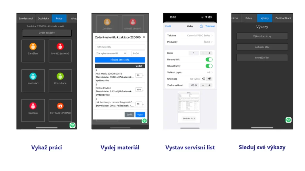 - zaznamenáte vydání materiálu na zakázku, čímž usnadníte přípravu na další den,